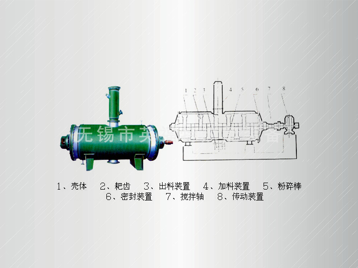 被幹燥物料從殼體上方正中間加入,在不斷正反轉動的耙齒的攪拌下,物料軸向來回走動,與殼體內壁接觸的表麵不斷新,受到蒸汽的間接加熱,耙齒的均勻攪拌,粉碎棒的粉碎,使物料內的水份氣化,在真空係統的作用下,使被幹燥物料內部水份和表麵水份有利的排出,氣化的水份經幹式除塵器、濕式除塵器、冷凝器,從真空泵出口處放空。