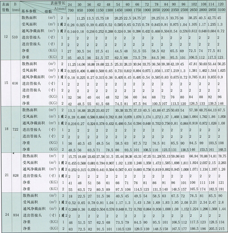 UⅡ型蒸汽散熱器有各種不同表麵管長、管數、排數及翅片片距的多種配合,計有大小規格七百六十五種。