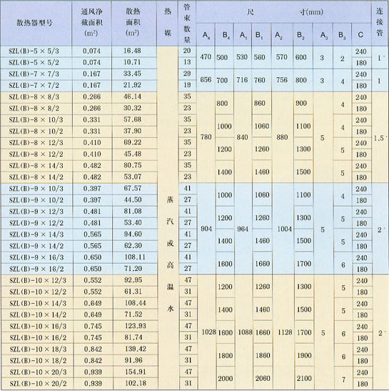 SZL(B)型翅片管散熱器,用無縫鋼管φ25×2.5mm作為基管,鋁孔翅片管外徑為直徑57mm,根徑為φ26.5mm,片距為2.8mm組成。散熱性能好、使用可靠、耐腐蝕性、光潔、美觀。應用於乳品、啤灑、食品、澱粉、化工、造紙、機械、醫-藥、空調、印染等行業。